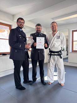 So ergab sich eine Summe von 865 €, die das Seong Taekwondo der FFW Harburg und dessen Vorsitzenden Andreas Faul und ihrem Kommandanten Florian Gaudera überreichte.