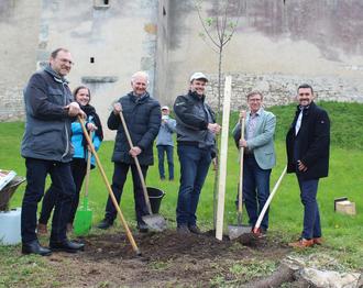 Von links: bei der Pflanzung eines „Leitheimer Streiflings“: Ralf Hermann Melber (Pomologenverein), Michaela Weber (Streuobstkoordinatorin Regierung von Schwaben), Friedrich Hertle (Kulturstiftung Harburg), Günter Riegel, Martin Weiß (beide Landschaftspflegeverband), Landrat Stefan Rößle und Bürgermeister Christoph Schmidt