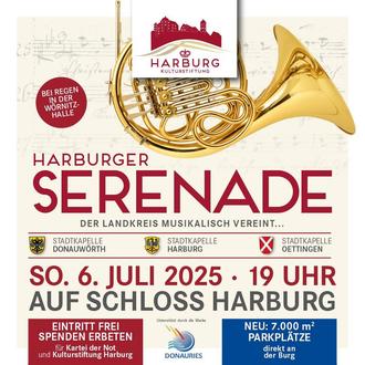 Im Schlosshof der Harburg findet um 19 Uhr ein Benefizkonzert mit rund 150 Musikern der Stadtkapellen aus Harburg, Donauwörth und Oettingen statt. Das Programm umfasst böhmische Polkas, flotte Märsche und bekannte Melodien. Der Eintritt ist frei, Spenden sind willkommen. Der Erlös geht an die „Kartei der Not“ und die Kulturstiftung Harburg. Bei Regen wird die Veranstaltung in die Wörnitzhalle verlegt.