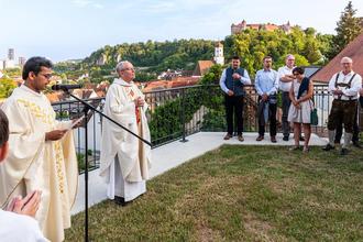 Nach den Grußworten von Herrn Bürgermeister Christoph Schmidt, Herrn Dipl.-Ing. (FH) Georg Hienle und Verwaltungsleiter Andreas Vogelsang folgte die feierliche Segnung der fertig gestellten Maßnahmen an der Stützmauer des Osthangs.