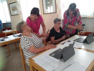Vortragende Sigrid Müller aus Dillingen ist Kaufmännische Assistentin für EDV & Rechnungswesen und Fachlehrkraft. Seit 25 Jahren arbeitet sie als freiberufliche EDV-Dozentin für verschiedene VHS und gibt Online-Kurse. Unterstützt von ihrer Assistentin Anette Keiß zeigte sie den Teilnehmer/innen in verständlicher Sprache den Einstieg in die digitale Welt. Wie komme ich ins Internet? Wie kann ich mich darin sicher bewegen? Wie finde ich, was ich suche? Dabei konnten die Teilnehmenden an den zur Verfügung gestellten Endgeräten arbeiten und später die Anwendungen auf ihren eigenen Geräten einsetzen.