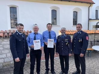1. Vorsitzender Simon Schmidbaur, Ehrenmitglied Josef Schmidbaur, Ehrenmitglied und Ehrenkommandant Franz Schiffelholz, Kreisbrandmeister Reiner Häfele, 1. Kommandant Stefan Wiedenmann