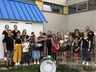 Das Bild zeigt die teilnehmenden Kinder des Ferienprogrammes zusammen mit den Jugendleiterinnen und weiteren Musikerinnen und Musikern der Stadtkapelle Harburg. Bild: Daniel Langer.