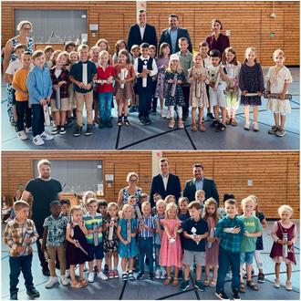 Bereits seit vielen Jahren ist die Grund- und Mittelschule Harburg eine JeKi-Schule. Das Projekt „JeKi – Jedem Kind ein Instrument“ ermöglicht, durch die finanzielle Unterstützung der Sparkasse, den Kindern der ersten Klasse eine kostenlose Blockflöte und zugleich kümmert sich die Schule um den Flöten-Unterricht. Vergangenen Dienstag fand die Einschulung an der Grund- und Mittelschule in der Wörnitzhalle in Harburg statt. Rund 50 Erstklässler:innen starteten in ihren ersten Schultag. Mit dabei waren auch Stellvertreter der Sparkasse Donauwörth, welche im Anschluss an die Grußworte die Musikinstrumente an die Schüler:innen verteilt haben. Unser Bild zeigt die Klasse 1a (oben) und die Klasse 1b (unten) mit der Direktorin Stefanie Fuß, den jeweiligen Klassenlehrer:innen, Susanne Ablaßmeier-Reiner (1a) und Robert Schmidt (1b), Bürgermeister Christoph Schmidt und den stellvertretenden Leiter der Geschäftsstelle Harburg, Sebastian Bitomsky.