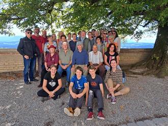 Wahnsinn! Was ist das für ein toller Ausblick bei schönstem Wetter am 02.09.2023 vom Hohen Peißenberg: In allen Richtungen bewaldete Ebenen, Dörfer und Bergketten! Und dazu noch die stimmungsvolle Bläsermusik des Posaunenchores Ebermergen.