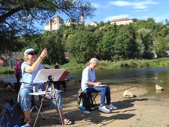 Barbara Hirsekorn (links) beim Skizzieren an der Wörnitz