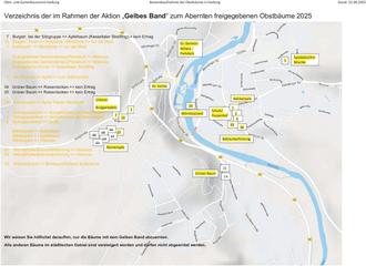 Der Obst-und Gartenbauverein, die Stadt Harburg, Firma Märker und die Evangelische Kirche beteiligen sich an der Aktion „Gelbes Band“. Alle Bäume, die im Stadtgebiet mit einem gelben Band gekennzeichnet sind, dürfen kostenlos abgeerntet werden. Dadurch werden die Früchte verwertet und die Lebensmittel vor dem Verderben gerettet. Das Sammeln erfolgt auf eigene Gefahr. Andere Bäume sind entweder im Rahmen der Obstbaumversteigerung kostenpflichtig eingesteigert worden oder gehören privaten Besitzern.