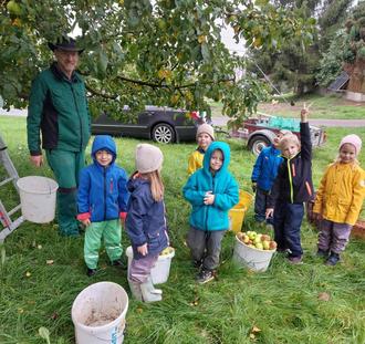 Die Kinder sammelten mit Herrn Melber und ihren Erzieherinnen am Freitagvormittag viele Äpfel.