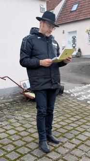 Den Reigen eröffnete der Heroldinger Lokalhistoriker Ralf Melber an den Informations-tafeln in der Dorfmitte. Er hatte nicht nur über die Vita des bedeutenden und in Heroldingen geborenen Reformators Georg Karg geforscht und publiziert, sondern auch das Leben einiger anderer in Heroldingen Wirkenden oder aus Heroldingen Stammenden aus den Archiven geholt und verständlich aufbereitet. Vor einer interessierten Zuhörerschar informierte er sachkundig und kompakt beispielsweise über den Harburger Kanzler Christoph Gugel, den Kammerdiener Nikolaus Beck, das Dichterpaar Michael und Sybilla Schuster sowie über den Schriftsteller und Geistlichen Otto Friedrich Hörner.