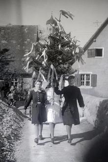Ein geschmücktes Bäumchen für die Hebauf-Feier beim Wiederaufbau der Steinernen Brücke Harburg