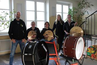 Das Bild zeigt die Musikerinnen und Musiker des Schlagzeugregisters, von links nach rechts: Philipp Korntheuer, Johannes Baalß, Alexandra Grün-Wiedenmann, Jasmin Lang und Karin Brechenmacher mit den neuen Instrumenten.