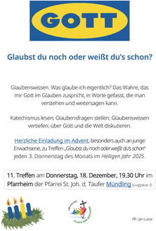| 19:30 Uhr | Gott - Glaubst du noch, oder weißt du's schon Glaubenswissen leichtgemacht, Pfarrheim Mündling! |