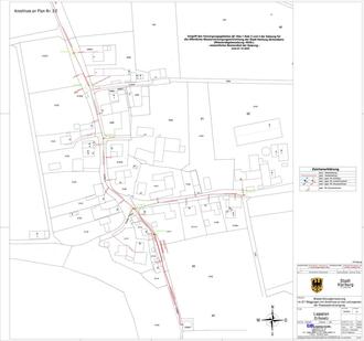 | (1) | Bevor die Anlage des Grundstückseigentümers hergestellt oder wesentlich geändert wird, sind der Stadt folgende Unterlagen in doppelter Fertigung einzureichen: | |