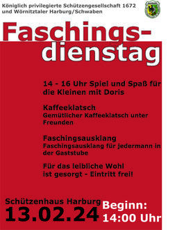 Die Harburger Schützengesellschaft lädt am Faschingsdienstag, den 13. Februar 2024 ab 14:00 Uhr, zum Kinderfasching auf den Leitenberg ein.