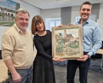 Foto: Walter und Gabi Vit bei der Übergabe mit Bürgermeister Schmidt. Das Gemälde auf dem Foto schuf Theo Guillery.