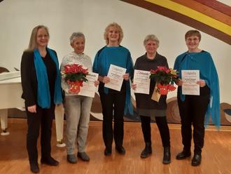 Beim „Plätzle-Essen“ konnten im Kirchenchor außergewöhnliche Ehrungen vorgenommen werden. Für herausragende 60 Jahre aktives Singen wurde Marianne Kukulus vom Vorstand Monika Funk geehrt. Mit ihrer kräftigen Altstimme ist sie seit 1964 dabei. Da der Chor jetzt als Frauenchor agiert, übernimmt Marianne auch die 3. Frauenstimme. Mit ihrer offenen Art leistet sie wichtige Beiträge in der Chorarbeit und nimmt stets rege an den Proben und Auftritten teil.