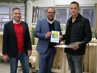 Die weitverbreitete Annahme, dass ressourcenschonendes Wirtschaften Geld kostet, kann Marcus Riedel gar nicht teilen. „Wir haben Kostenvorteile, weil wir effizienter und schlanker arbeiten“, sagte der Geschäftsführer beim gemeinsamen Firmenrundgang mit Sebastian Straubel, Lautertals Bürgermeister Karl Kolb und Martin Schmitz, dem Leiter der Wirtschaftsförderung des Landkreises Coburg. Die Anforderungen, die ein Partner des Umwelt- und Klimapakts erfüllen muss, hat die Holzmanufaktur Riedel um ein Vielfaches übertroffen. Unter anderem auch mit der Entscheidung, einen Großteil des Firmenfuhrparks auf Elektrofahrzeuge umzustellen. Das habe aber nur funktioniert, weil der Lautertaler Handwerksbetrieb mit rund 30 Mitarbeitern bei vielen Förder- und Finanzierungsprogrammen die Nase vorne hatte, erklärte Marcus Riedel: „Man muss Spitzenreiter sein, wenn man davon profitieren will.“