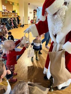 Er brachte allen Kindern ein Geschenk in der selbst bedruckten Stofftasche. Beim Besorgen der Geschenke wurde er von unserem Elternbeirat tatkräftig unterstützt.