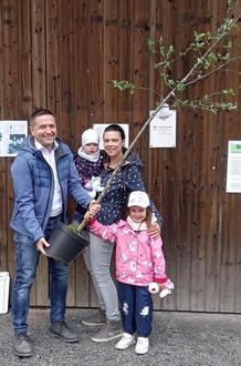 Bürgermeister Karl Kolb überreicht einen Apfelbaum an Lotta, Sabrina und Finja Gülden