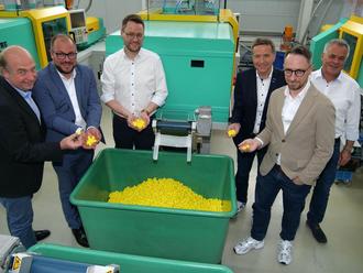 Das Gelb kennt jeder: Die Pipetten des bekanntesten deutschen Schnupfenmittels werden bei der Firma Heim im Lautertal hergestellt. Martin Schmitz, Sebastian Straubel, Dr. Sebastian Heim, Karl Kolb, Cedric Lindner (Gemeinde Lautertal) und Matthias Heim (von links) bei der Besichtigung der Produktionsanlagen.
