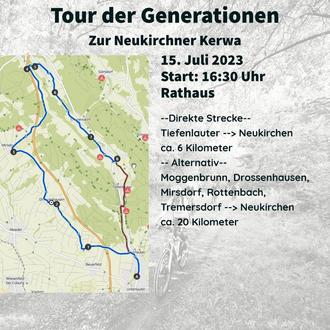 Am Samstag, 15.07.2023, findet die Tour der Generationen statt. Start ist um 16.30 Uhr am Rathaus. Unser Ziel ist die Neukirchner Kerwa.