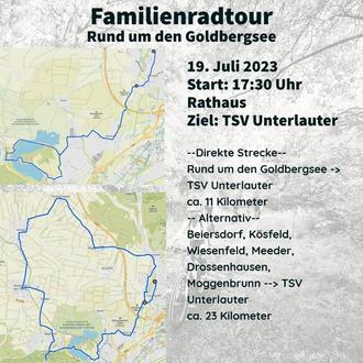 Am Mittwoch, 19.07.2023, findet die Familienradtour statt. Start ist um 17.30 Uhr am Rathaus. Die Einkehr findet im Sportheim Unterlauter statt.