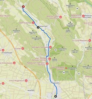 Wir fahren vom Rathaus Lautertal über den Pfarrleitenweg und Hühnerbergsweg auf überwiegend befestigten Wegen bis nach Neukirchen.