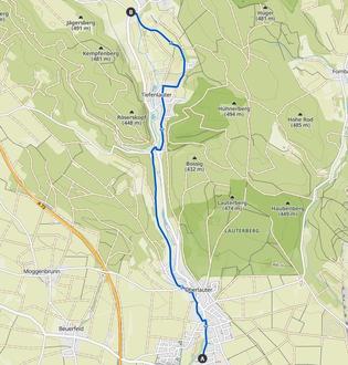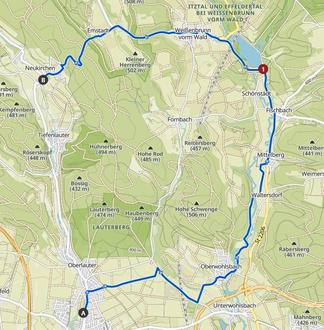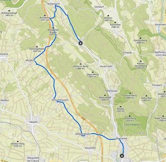 Wir fahren vom Rathaus Lautertal über den Pfarrleitenweg nach Tiefenlauter, dort den Hühnerbergsweg entlang nach Neukirchen, am Skilift vorbei bis nach Tremersdorf.