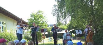 Nachdem Feiern und Freuen einen wichtigen Platz in unserem Leben einnehmen sollte, haben wir uns ein besonderes Event für unsere Kinder überlegt. Der „Streichsalat“ aus dem Landestheater Coburg kam zu uns in den Garten und es wurde ein perfektes klassisches Open Air Ereignis. Die Kinder lauschten den faszinierenden Klängen von Mozart, Vivaldi und andere mehr. Diese wurden von fünf Berufsmusikern auf Streichinstrumenten, wie Cello, Kontrabass und Geigen vorgetragen.