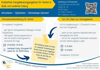 Die Coburg Stadt und Land aktiv GmbH bietet in Zusammenarbeit mit einem Energieberater kostenfreie Energieberatungen für Vereine an. Unter dem Motto "Informieren – Optimieren – Vereinskasse schonen!" finden in diesem Jahr speziell für Vereine eine maßgeschneiderte Informationsveranstaltung und Beratungstermine statt.