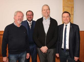 Obmann Wolfgang Mierzwa, Landrat Sebastian Straubel und Bürgermeister Karl Kolb gratulieren Walter Flohrschütz (2. von rechts) zu dessen Ehrung.
