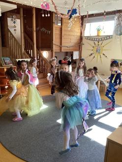 Der Tag begann mit einem fröhlichen gemeinsamen Frühstück. Die kleinen Närrinnen und Narren stärkten sich mit Wiener, Laugengebäck, Gemüsesticks und zum Nachtisch Popcorn. Danach wurde zu Faschingsmusik ausgelassen getanzt und gefeiert.