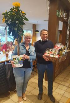 Im Anschluss an die Führung erfolgte im Rahmen eines gemeinsamen Abendessens im Sportheim des TSV Oberlauter ein reger Gedanken- und Erfahrungsaustausch. Ute Hopf bedankte sich bei ihrem Amtskollegen Karl Kolb für die Einladung und überreichte einen Hibiskus mit dem Wappen beider Kommunen. Karl Kolb übergab dem Stadtoberhaupt aus Schalkau einen Präsentkorb mit Spezialitäten aus dem Coburger Land.