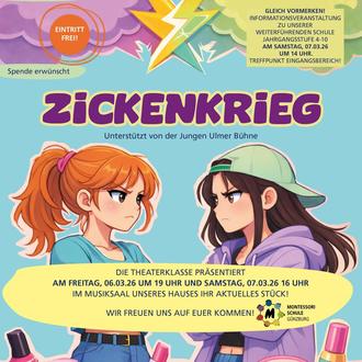 Am Freitag, 06.03.26 um 19.00 Uhr und am Samstag, 07.03.26 um 16.00 Uhr findet im Musiksaal der Montessori-Schule Günzburg eine Theateraufführung der Theaterklasse statt. Die Schüler und Schülerinnen präsentieren das Stück „Zickenkrieg“ mit Unterstützung der jungen Ulmer Bühne. Der Eintritt ist frei und eine Spende ist erwünscht.