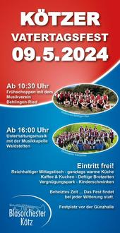 Das Blasorchester Kötz lädt recht herzlich zum traditionellen Kötzer Vatertagsfest, am Donnerstag, den 09. Mai, ein. Beginn ist um 10:30 Uhr mit einem Frühschoppen mit dem Musikverein Behlingen-Ried. Ab 16:00 Uhr wird der Musikverein Kissendorf mit Polka, Marsch und Walzer für zünftige Stimmung im beheizten Bierzelt am Festplatz vor der Günzhalle sorgen.
