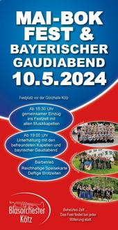 Am Freitag, den 10. Mai, wird wieder das Mai-BOK-Fest mit Bayerischem Gaudiabend zusammen mit drei befreundeten Kapellen veranstaltet. Mit dabei sind dieses Jahr der Musikverein Unteressendorf, der Musikverein Edelstetten, und der Musikverein Lyra Offingen.
