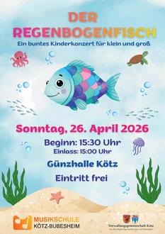 Die Musikschule Kötz-Bubesheim lädt herzlich zu ihrem Kinderkonzert mit dem Titel „Der Regenbogenfisch" ein. Die Veranstaltung findet am Sonntag, den 26. April 2026, um 15:30 Uhr in der Günzhalle in Kötz statt.