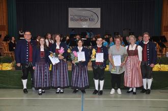 Wie jedes Jahr ehrte das Blasorchester Kötz auch am diesjährigen Ostersonntag einige seiner langjährigen und verdienten aktiven Mitglieder. Frau Brigitte Wöhrle, Beisitzerin des ASM-Bezirk 12, war als Vertreterin des Allgäu-Schwäbischen Musikbundes zu Gast und führte die Ehrungen durch. Für 10-jährige Mitgliedschaft wurden Claudia Ost-Linder (Posaune) und Sebastian Weber (Tuba) geehrt. Für ganze 25 Jahre voller Musik und Unterstützung wurden Theresa Hafner (Klarinette) und Franziska Engelhart (Klarinette) ausgezeichnet.
