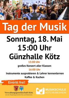 Die Musikschule Kötz-Bubesheim lädt herzlich ein zum "Tag der Musik" am Sonntag, den 18. Mai 2025 in die Günzhalle Kötz.