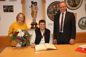 Mit dem Eintrag ins Goldene Buch ehrte die Gemeinde Maihingen den Sportschützen Edwin Vietz. Nach zwei Deutschen Meisterschaften in Hannover (Disziplin Auflage KK100) und Dortmund (Disziplin Auflage Luftgewehr zehn Meter) lud der Gemeinderat ihn und seine Familie sowie Mitglieder des Schützenvereins ins Schützenheim ein, um diese besonderen Erfolge zu würdigen und zu feiern. Im Laufe seiner inzwischen 50-jährigen Schützenkarriere errang er unzählige Erfolge und Titel wie Schützenkönig, Vereinsmeister, Gaukönig, schwäbischer und bayerischer Meister, sowie Bronze, Silber und Gold bei den Deutschen Meisterschaften. Zudem war er auch als Jugendtrainer für den Ries-Gau sehr erfolgreich. Edwin Vietz repräsentierte damit nicht nur sich und den Schützenverein Maihingen sondern auch die Gemeinde Maihingen in besonderer Weise weit über das Ries hinaus. Daher gratuliere ich ihm mit großer Anerkennung auf diesem Wege noch einmal ganz herzlich.