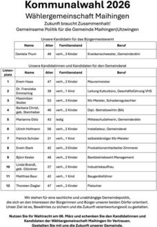 Nutzen Sie Ihr Wahlrecht am 08. März und schenken Sie den Kandidatinnen und Kandidaten der Wählergemeinschaft Maihingen Ihr Vertrauen.