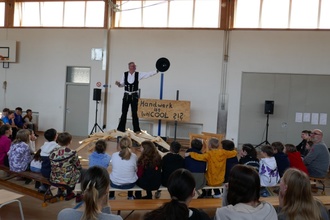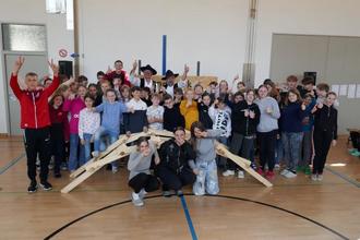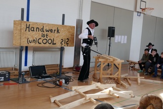 „Hand & Werk“ hieß das Einmanntheater, das am 14.03.24 von Richard Betz in der Moll-Berczy-Mittelschule Wallerstein aufgeführt wurde. Mit seiner Geschichte wollte er den Jugendlichen klarmachen, dass jeder seinen Beruf nach seinen Fähigkeiten und Talenten aussuchen soll. Nicht ein Studium macht einen auf Dauer glücklich sondern ein Beruf, der einen ausfüllt und den man gerne macht. Während der Zimmermann seine Geschichte erzählte, baute er, ganz nebenbei, eine Leonardo-Brücke auf. Dies ist eine Brücke, die ganz ohne Schrauben und Nägel auskommt. Begeistert berichtete er von seinem Handwerk und forderte die Zuschauer auf Praktika zu machen, um herauszufinden, was zu einem passt. Als die Brücke stand durften zwei Schüler ihren Halt testen. Am Ende standen der Zimmermann Richard Betz und Günter Schnell von der Zimmererinnung für Fragen zur Verfügung.