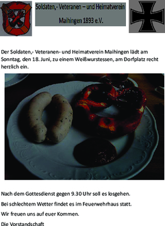 Der Soldaten,- Veteranen- und Heimatverein Maihingen lädt am Sonntag, den 18. Juni, zu einem Weißwurstessen, am Dorfplatz recht herzlich ein.