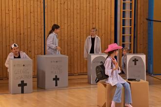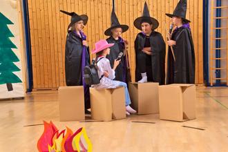 Unterstützung erhielt die Theater-AG vom Chor der 6. Klasse, der von Rektorin Brigitte Ulbricht geleitet wurde. Herr Johannes Moll begleitete den Chor mit dem Klavier. Ein herzlicher Dank geht auch an die 6. und 7. Klassen, die die Kulissen und ein Großteil der Kostüme erstellten. Zum Abschluss erhielten die jungen Schauspielinnen und Schauspieler donnernden Applaus für ihren Auftritt!