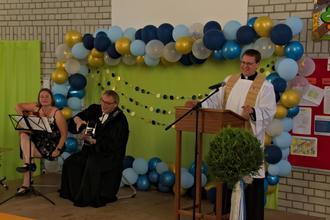 In einer kurzen Andacht machten Pfarrer Haimböck und Dekan Eichler deutlich, dass die Schülerinnen und Schüler im Laufe ihrer Schulzeit Schlüsselkompetenzen erworben hätten, die ihnen für ihr restliches Leben helfen würden. Im wahrsten Sinne des Wortes hielten sie nun mit ihren Zeugnissen den Schlüssel in der Hand, um versperrte Türen aufzusperren und Hindernisse aus dem Weg zu räumen.