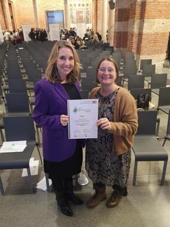 Kultusministerin Anna Stolz und Gesundheitsministerin Judith Gerlach haben in der Allerheiligenhofkirche der Münchner Residenz die Moll-Berczy-Mittelschule Wallerstein erneut als „Gute Gesunde Schule“ ausgezeichnet. Kultusministerin Stolz betonte: „Ihre wunderbaren Initiativen zu gesunder Ernährung, Stressprävention oder Bewegung machen unsere jungen Menschen gesünder und prägen sie im besten Fall ein Leben lang.“ Um die Auszeichnung zu erhalten, mussten die Schulen zwei Gesundheitsprojekte aus verschiedenen Themenfeldern umsetzen. Die Bandbreite reichte hier von Ernährung über Bewegung bis hin zu psychischer Gesundheit, aber auch Stress- und Suchtprävention spielten eine Rolle. In Vertretung der Schulleitung nahm Studienrätin Kathrin Kühnlein die Auszeichnung entgegen.