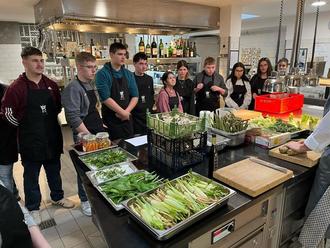 Sternegerichte aus Gemüse? – das geht! Das Rezept: Man nehme den Sternekoch Jockl Kaiser, viel grünes Gemüse, Kräuter aus dem Wald und ein paar mutige Schülerinnen und Schüler der Moll-Berczy Mittelschule Wallerstein und nutze die Küche im Restaurant Meyers Keller in Nördlingen. Gemüse mal ganz anders zubereitet, nicht nur als Beilage, das war das Motto der Kochaktion. Alte Gemüsesorten wie wilder Blumenkohl und Brokkoli kennenlernen, Giersch aus dem Wald probieren, außergewöhnliche Garungsarten wie Sous-vide-Garen oder Fermentieren testen, neue Reisarten entdecken, Eis und Rhabarberragout verkosten … Ein bunter Blumenstrauß an Gerichten zeigte auf, wie aus regionalen und saisonalen Lebensmitteln aus dem Garten leckere Gerichte zustande kommen. Außerdem lernten die Jugendlichen das Berufsbild eines Kochs und einer Servicekraft kennen.