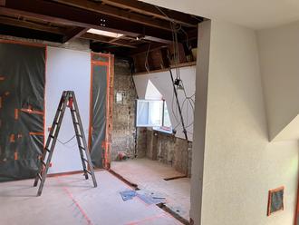 Mit den Arbeiten im Rathaus wurde am 2. Oktober begonnen. Im Vorfeld des Abbruchs erfolgte bereits der Rückbau von störenden Heizungs-, Wasser- und Stromleitungen. Sämtliche nicht vom Bau betroffene Gebäudebereiche und sämtliche Bewegungsflächen wurden durch Staubwände und schützende Holzfaserplatten z.B. auf dem Natursteinboden gesichert. Nicht mehr benötigte Türen und Sanitärelemente wurden ausgebaut und die statisch notwendigen Vorarbeiten durchgeführt. Danach konnten bereits mit den notwendigen Durchbruch- und Abbrucharbeiten begonnen werden. Als zukünftige Arbeiten stehen das Herausschneiden der Öffnungen des zukünftigen Aufzugschachtes (neben der Treppe) an und auch eine Logistiköffnung für den Kran wird ins Dach eingebracht. So können Abbruch- und Baumaterial entsorgt werden.