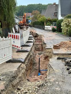 Ein Teil der Hauptwasserleitung ist bereits durch unsere Mitarbeiter verlegt und nun werden die ersten neuen Hausanschlüsse (teils offene Bauweise oder geschlossen mittels Erdrakete) durch Mitarbeiter des Bauhofes und der Gemeindewerke Ahorn hergestellt. Parallel erfolgt zudem noch die Mitverlegung einer neuen Glasfaser-Verbandleitung. Dies geschieht im Vorgriff für einen zukünftigen Ausbau, um dann ein erneutes Öffnen der neu asphaltierten Straße zu vermeiden.