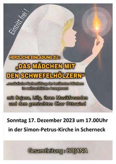 | 17.00 Uhr | Musikalischer Gottesdienst "Das Mädchen mit den Schwefelhölzern" mit Bojana Blohmann und Chor |
